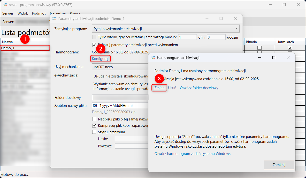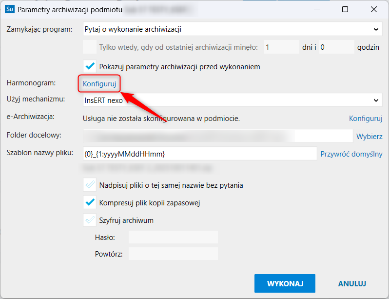 Harmonogram można także zaktualizować z poziomu poszczególnych programów nexo w oknie parametrów archiwizacji, które wyświetla się przed archiwizacją podmiotu wykonywaną przy zamykaniu programu.