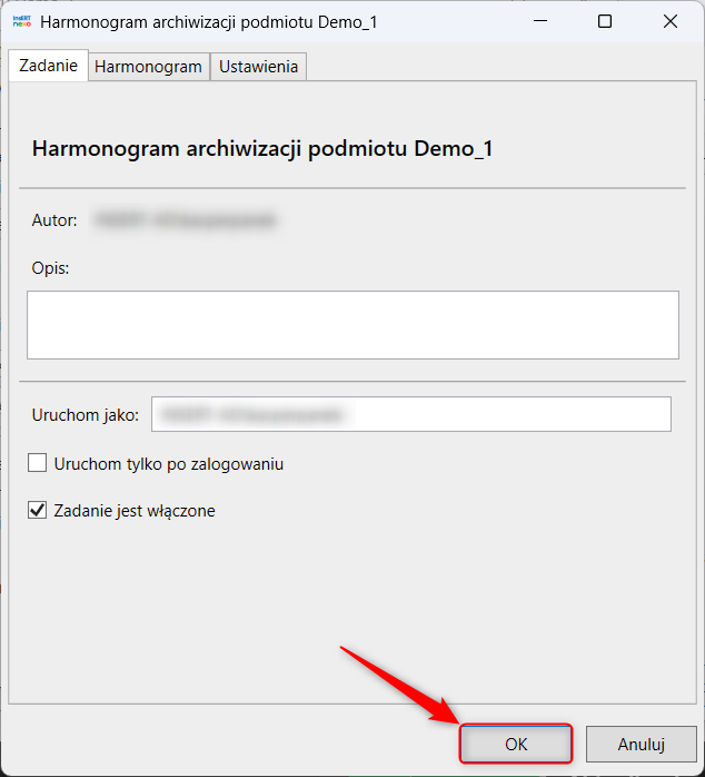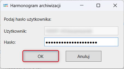 4. W edytorze harmonogramu wybrać OK (wprowadzanie zmian nie jest konieczne) i potwierdzić aktualizację, wpisując hasło użytkownika.