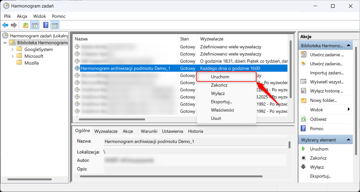 Ustawienia harmonogramu zostaną zaktualizowane, dzięki czemu archiwizacja będzie działać. Zalecane jest, aby po wykonaniu opisanych czynności otworzyć harmonogram zadań systemu Windows i ręcznie uruchomić poszczególne zadania archiwizacji w celu przetestowania poprawności ich działania. Jeśli archiwizacja zostanie przeprowadzona poprawnie, to plik archiwum powinien znajdować się we właściwym docelowym katalogu. Można również sprawdzić przebieg archiwizacji w pliku logu, zapisywanym w katalogu: