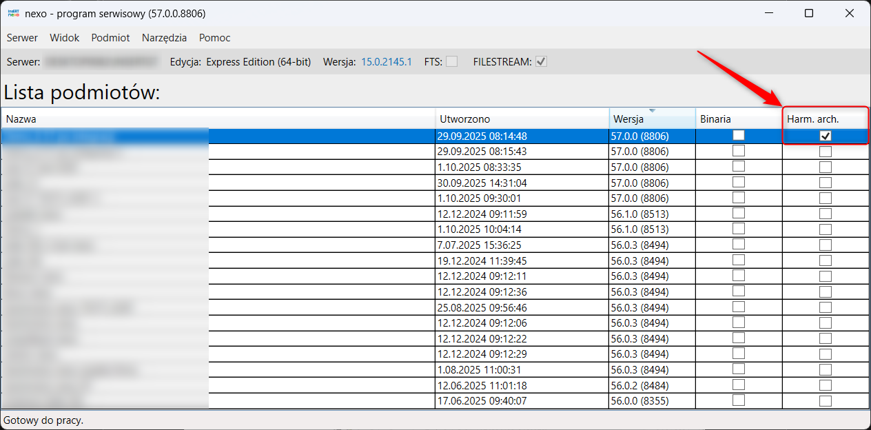 Aby ułatwić aktualizowanie harmonogramów, w Programie serwisowym w wersji 57 dodano na liście podmiotów kolumnę wyświetlającą informację o tym, czy dany podmiot ma zdefiniowany harmonogram archiwizacji.
